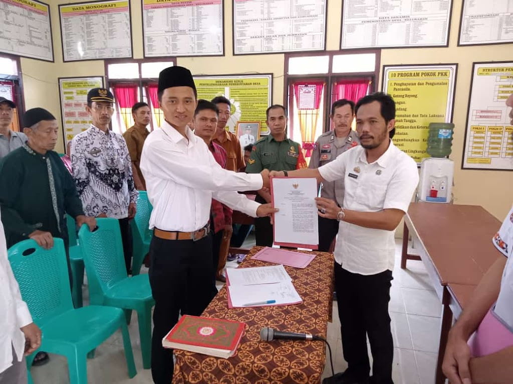 Pelantikan ditandai dengan penyerahan SK dengan nomor SK 141/02/KPTS/2004-V.11/2023 tentang pengangkatan Juru Tulis atas nama Hengky Saputra yang disaksikan oleh unsur Pemerintah Kecamatan, Bhabinkamtibmas, Babinsa, LHP serta jajaran Aparatur Pekon dan para tokoh masyarakat.