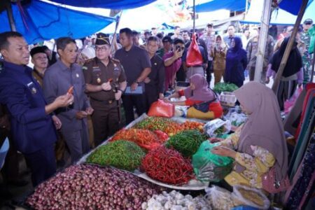 Pringsewu – Bupati Pringsewu, H. Riyanto Pamungkas, bersama Forkopimda Pringsewu turut hadir Kajari Pringsewu Raden Wisnu Bagus Wicaksono, SH., M. Hum, Ketua DPRD Pringsewu Suherman, SE, Dandim 0424 Tanggamus yang diwakili oleh Pabung Pringsewu Kapten. Rahmat, turut hadir juga Kepala BPS Pringsewu Eko Purnomo, SST., MM, rombongan melakukan inspeksi di pasar tradisional untuk memantau harga dan ketersediaan kebutuhan pokok pada minggu pertama Ramadhan 1446 H, Senin (10/3/2025).